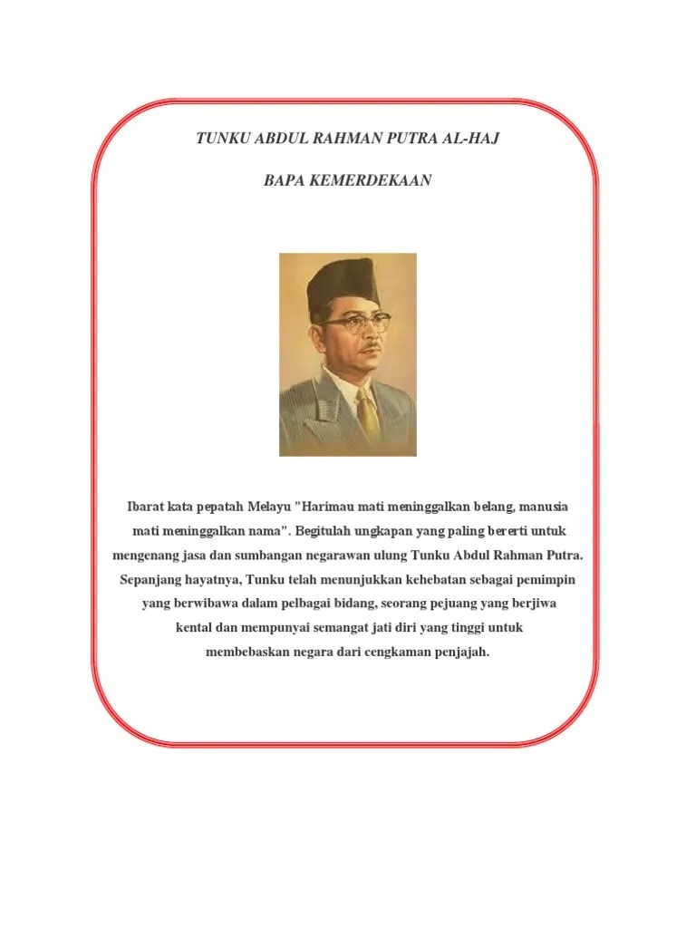 Sehingga tamat berkhidmat kepada negara dipelihara di arkib dan pustaka ini . Sumbangan tunku abdul rahman sepanjang penglibatan tunku abdul rahman dalam bidang politik,beliau banyak memberi sumbangan kepada bangsa dan negara. Filipina mendakwa sabah dipajak dan buka diserahkan kepada baron overbeck dan . Tema 4 pengisian kemerdekaan latar belakang puterasultanabdul halimshah dilahirkan pada 8 februari 1903;